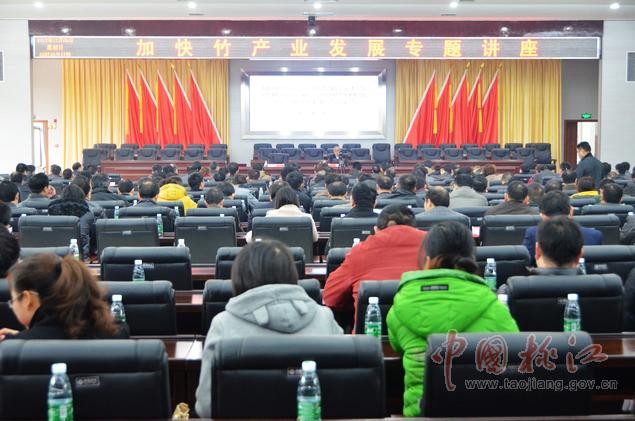 12月9日,黨政大樓附屬樓三樓會議室里,一場高規(guī)格的加快竹產(chǎn)業(yè)發(fā)展專題講座在這里舉行??h委副書記何軍田主持,縣領(lǐng)導唐學文、李質(zhì)彬、馬文才、陳震宇、胡國清、肖立新、張亮榮、劉武出席。副處級以上干部,縣直單位、鄉(xiāng)鎮(zhèn)負責人,林業(yè)系統(tǒng)工作者共400余人濟濟一堂,認真聆聽了中國工程院院士、中國竹子加工利用首席科學家、南京林業(yè)大學教授張齊生和國家林業(yè)局竹子研發(fā)中心科研處處長、竹筍專家、高級工程師吳良如精彩而豐富的竹產(chǎn)業(yè)講課。